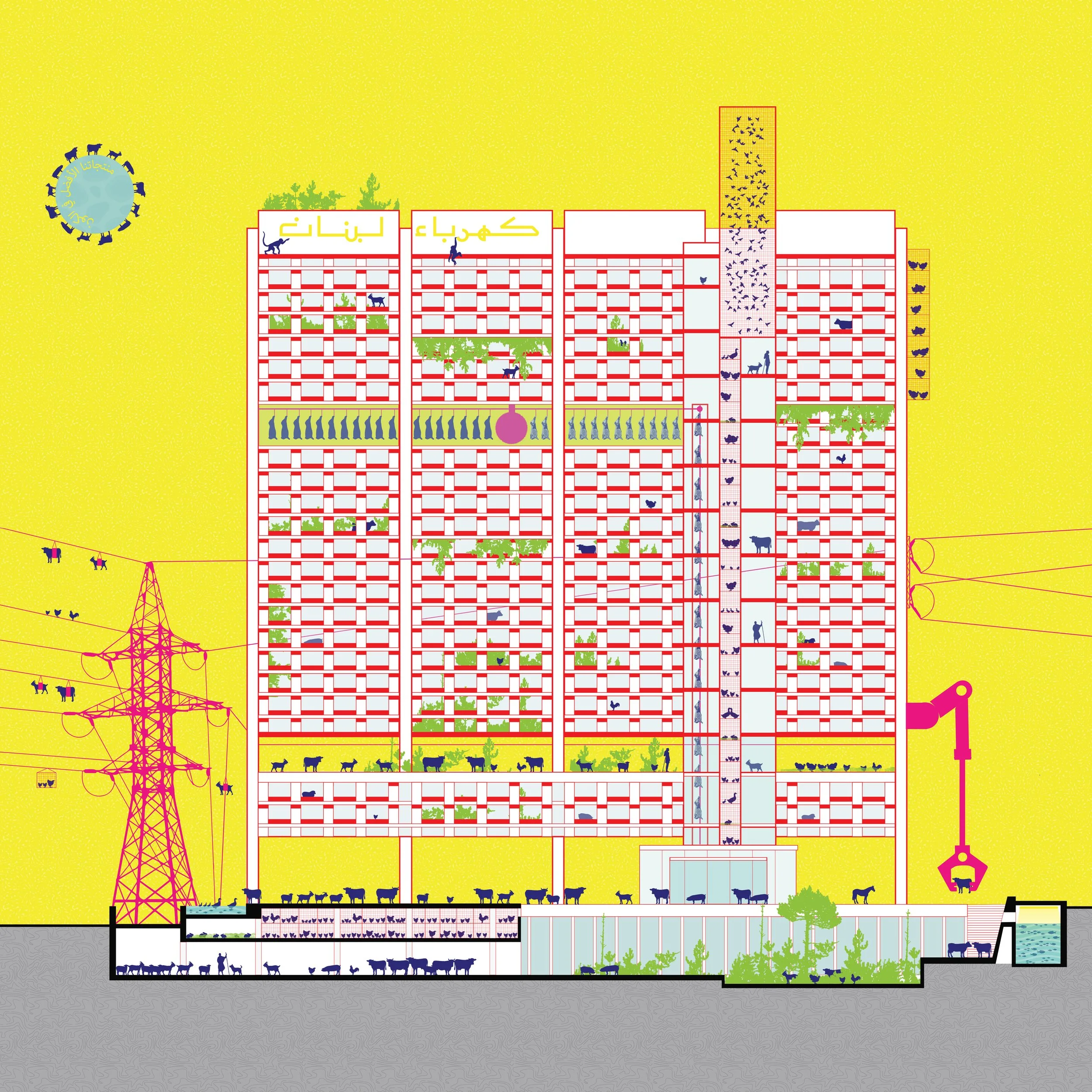 Figure 1. EDL Vertical Mazraa' is a cynical illustration that re-imagines the state-owned EDL (Electricity of Lebanon) Headquarters as an Urban Vertical farm controlled by competing entities.