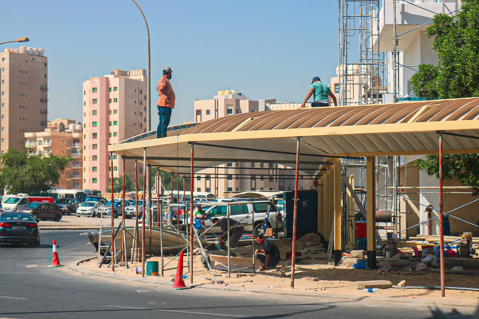 Image 29: Workers labouring in 50C heat to install parking shades, Hawalli