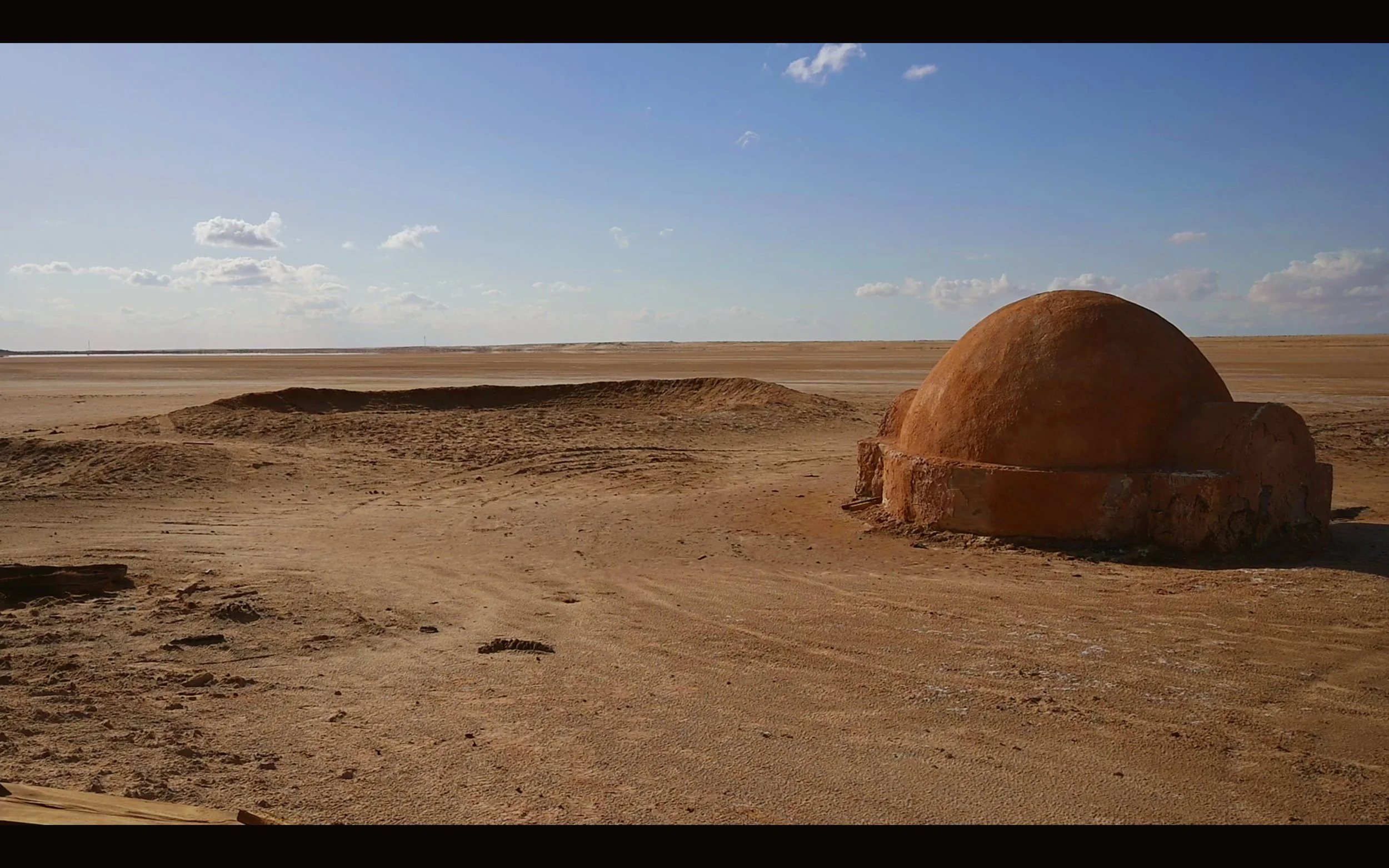 Like search parties from an alien planet, the US film industry landed in the intermittently dry salt lake of Chott el Djerid towards the end of the 20th century. They came to shoot the science fiction saga Star Wars for a generation that grew up "without fairy tales". Director George Lucas took his cue from buildings of the Imaziɣen when he dreamed up alien architecture for the Star Wars series. The low and domed dwellings of the Imaziɣen became the model for the igloo-like houses of the fictional desert planet Tatooine; the home of Anakin and Luke Skywalker above which twin suns set. It is an abandoned zone where the characters of the film exist only through the imprints they leave behind.