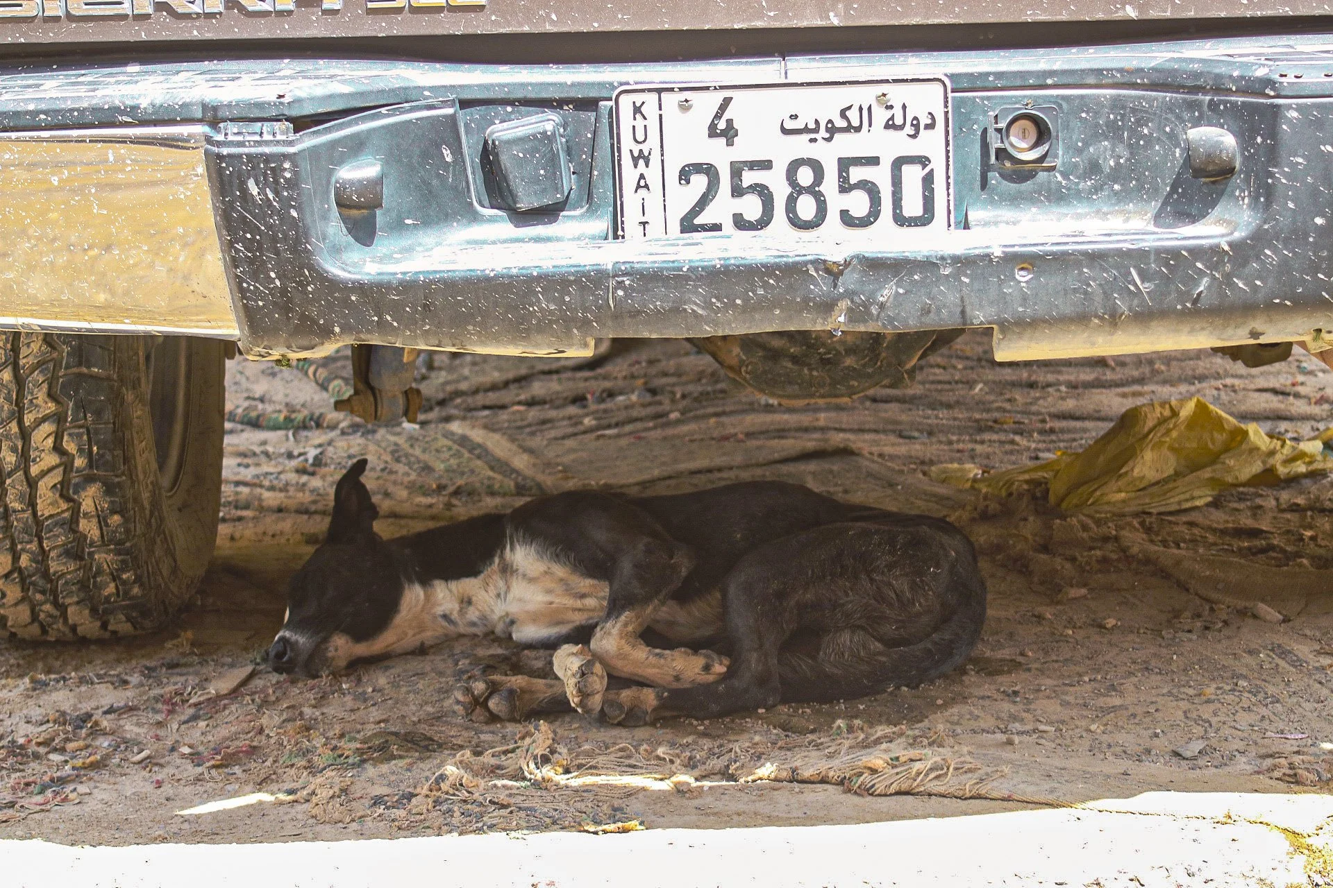 Image 31: Malnourished dog hiding from the heat. The carcasses of dead animals, birds, and other insects are a common sight during the summer months, Jleeb Al-Shuyoukh